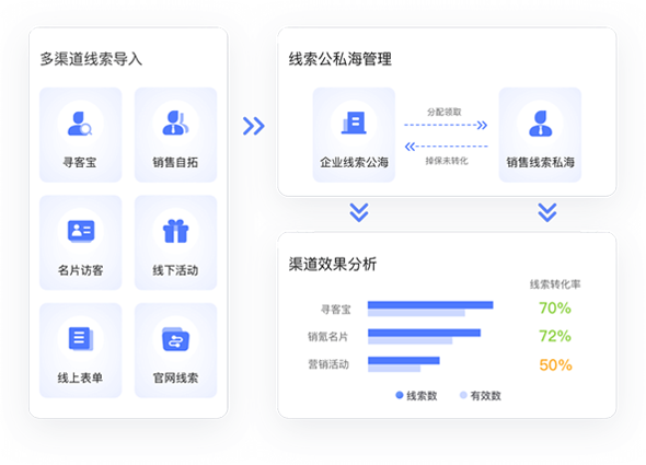 聚合尋客寶、名片、官網(wǎng)注冊、市場推廣、銷售自拓等多渠道線索,實現(xiàn)對線索的統(tǒng)一管理